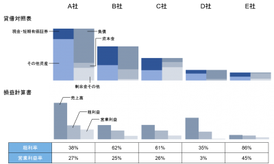 まずはBSをみてみましょうか。A社の BSの大きさが目をひきます。また、B社とC社、E社の現金・短期有価証券が資産の半分を占めることがわかります。つまり、キャッシュリッチな会社といえます。E社はまた、有利子負債はなく、無借金会社といえるかも知れません。無借金かつキャッシュリッチな会社はこの5つの企業ではどこなのでしょうか。