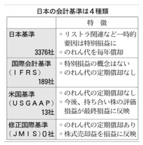 日経新聞では「日本基準では毎年一定額償却して費用計上するのに対し、IFRSでは価値が大きく減らない限り、費用と認識しない。決算上、利益の目減りが避けられ、M&Aに積極的な企業には採用メリットがある。」と説明しています。