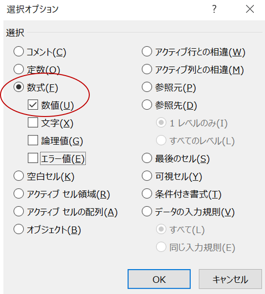 ちなみに下図のように「数式(F)」を選択し、「数値(U)」をチェックしたままOKをクリックすれば、すべての数式セルが選択されます。フォントの色が黒になっているかを確認することもできます。
