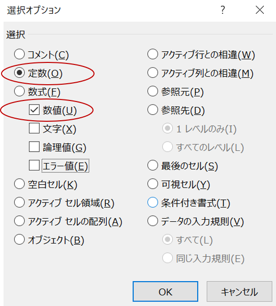 「定数(Q)」を選択すると、「数値(U)」、「文字(X)」、「論理値(G)」、「エラー値(E)」にチェックがつきます。「数値(U)」だけチェックを残し、あとはチェックを外します。