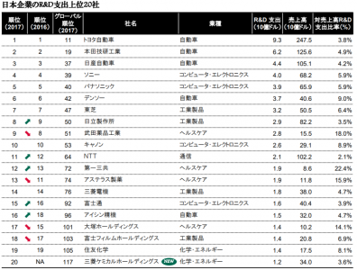 日本企業は昨年よりも6社多い171社がトップ1,000社にランクイン。日本企業ではトヨタが11位、ホンダが19位という結果でした。トヨタは調査開始以来、常に20位以内にランクインしてきたといいますから、すごいものです(上の表の赤字の企業は2005年以来毎年上位20位にランクインしている企業)。