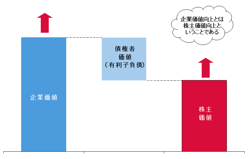 債権者の価値と有利子負債(=借入)とは同じです。有利子負債に価値があるというのは、妙な感じがしますが、金融機関などの債権者の立場で考えれば、りっぱな資産となります。企業価値から、この債権者にとっての価値である有利子負債を差し引くと株主にとっての価値になります。企業価値を高めるというのは、債権者、そして株主にとっての価値を高めることなのです。さらに、企業価値向上とは株主価値向上と同義と言えます。