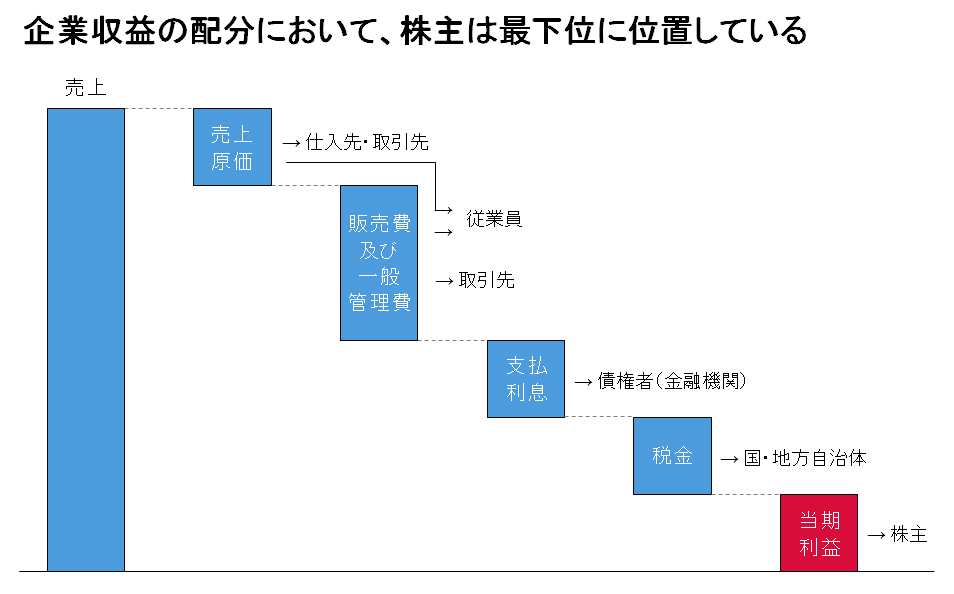 売上の配分においては、株主は最も弱い立場であるといえます。顧客に対する価値提供の見返りに企業は売上を受け取ります。そこからの配分を最初に受け取るのが仕入先・取引先です。そのあとが従業員であり取引先です。そして金融機関などの債権者が受け取り、国・地方自治体が受け取り、そして最後に残ったキャッシュを株主が受け取るのです。短期的に考えれば、売上は変わりません。誰かが多く受け取れば、その分だけ誰かの配分は減るわけです。株主が受け取る配分を増やそうとして、社長に要求して、仕入先、取引先、従業員が受け取る配分を減らさせたとしたら、どうなるでしょう。企業への価値提供に見合った十分な配分を受け取ることができなければ、仕入先、取引先、従業員はその企業から離れていきます。その結果、売上自体が減少し、株主が受け取る配分が減少することになります。長期的な視野に立つことのできる真っ当な株主であれば、そんな馬鹿なことをするはずはありません。これは理想論と考えるになる方もいるかもしれません。ただ、ここで強調しておきたいことは、株主価値を高めるという経営が株主だけがハッピーになる世界を目指しているわけではないということです。