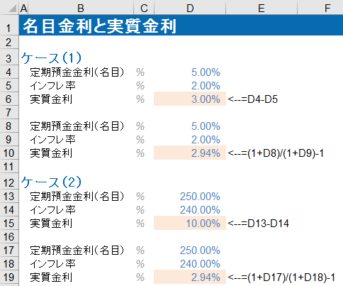 たとえば、上図のように、名目金利とインフレ率が低いケース(1)のような場合、近似式を使っても、実質金利は、0.06%(=3.00%-2.94%)の違いしかありませんが、ケース(2)では相当の開きがあります。ケース(2)まで定期預金の金利が高いことはないかもしれませんが、名目金利からインフレ率を差し引いて求める実質金利はあくまで概算であることは覚えておいてください。