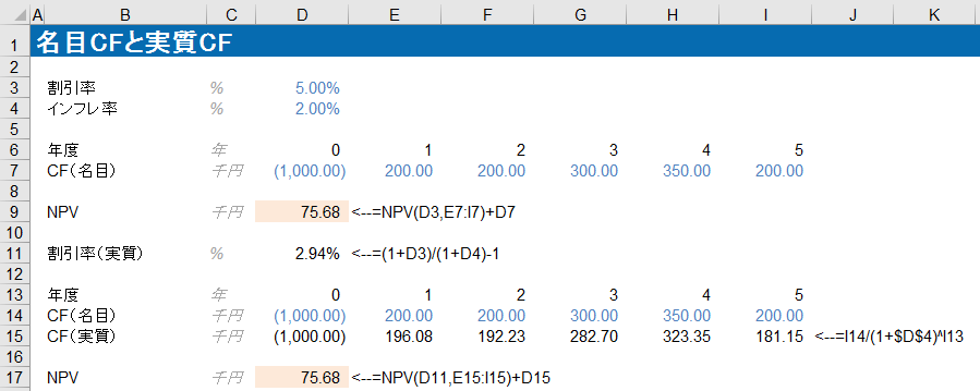 ここでの、期待インフレ率は、2.00%です。したがって、実質割引率は、2.94%(セルD11)と計算できます。実質キャッシュフローを実質割引率で割り引いても、NPVは75.68となり、名目ベースで計算した結果と同じ結果になります。