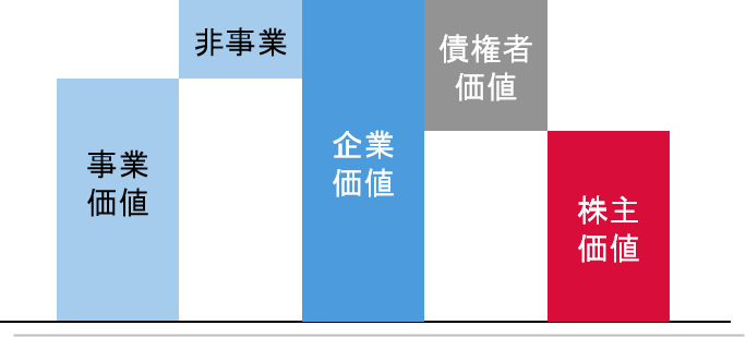企業価値は事業価値と非事業資産の価値に分けられます(下図左側ご参照)。事業価値とは、その企業が将来生み出すであろうFCF(フリーキャッシュフロー)の現在価値です。