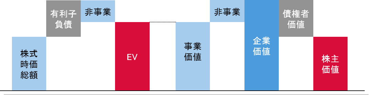 一方で、企業価値は誰に帰属するものかという観点で言えば、債権者価値(有利子負債)と株主価値に分けられます(上図右側ご参照)。