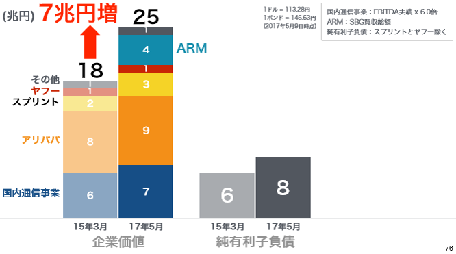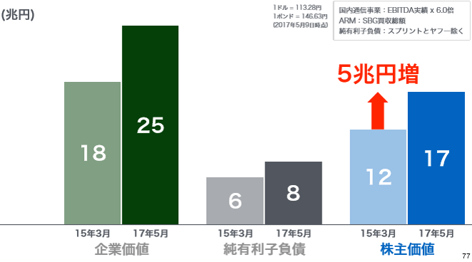 孫社長は、さらに株主価値について言及します。企業価値から純有利子負債を差し引いた株主価値は12兆円から5兆円増加して、17兆円となった。世の中の評価、つまり時価総額は9兆円だけれども、ソフトバンクの金の卵の価値は17兆円になったとこう言っているわけです。