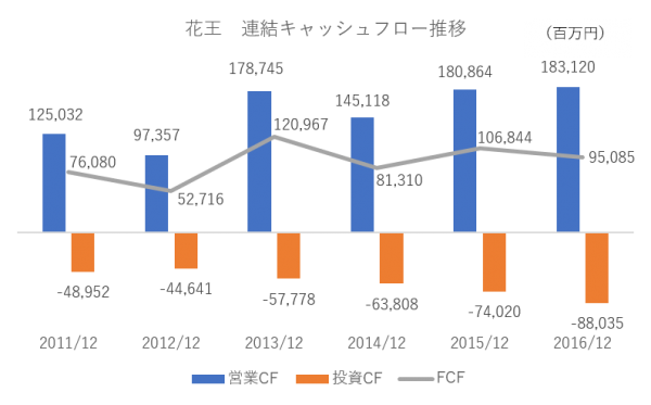 花王は、EVAを主指標として投下資本コスト意識した経営を行っていることで有名です。それでは、フリーキャッシュフローについては、沢田社長はなんと言っているのでしょうか。下図は、過去6年の同社のFCFです。